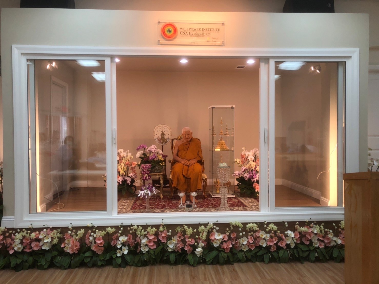 การจัดถวายดอกไม้เป็นดอกกล้วยไม้ในพิธีนั้น เนื่องด้วยพระอาจารย์หลวงพ่อเคยแพ้เกสรดอกไม้ระหว่างพำนักอยู่ประเทศแคนาดา มีครั้งหนึ่งที่อาจารย์แอนนานำดอกกล้วยไม้มาถวาย ท่านปรารภว่าดี จึงเป็นที่มาว่าเราจะเห็นดอกกล้วยไม้ในแจกัน ตบแต่งในฉากหลังต่างๆ ให้เห็นบ่อยๆ ...”